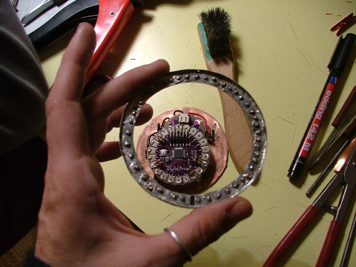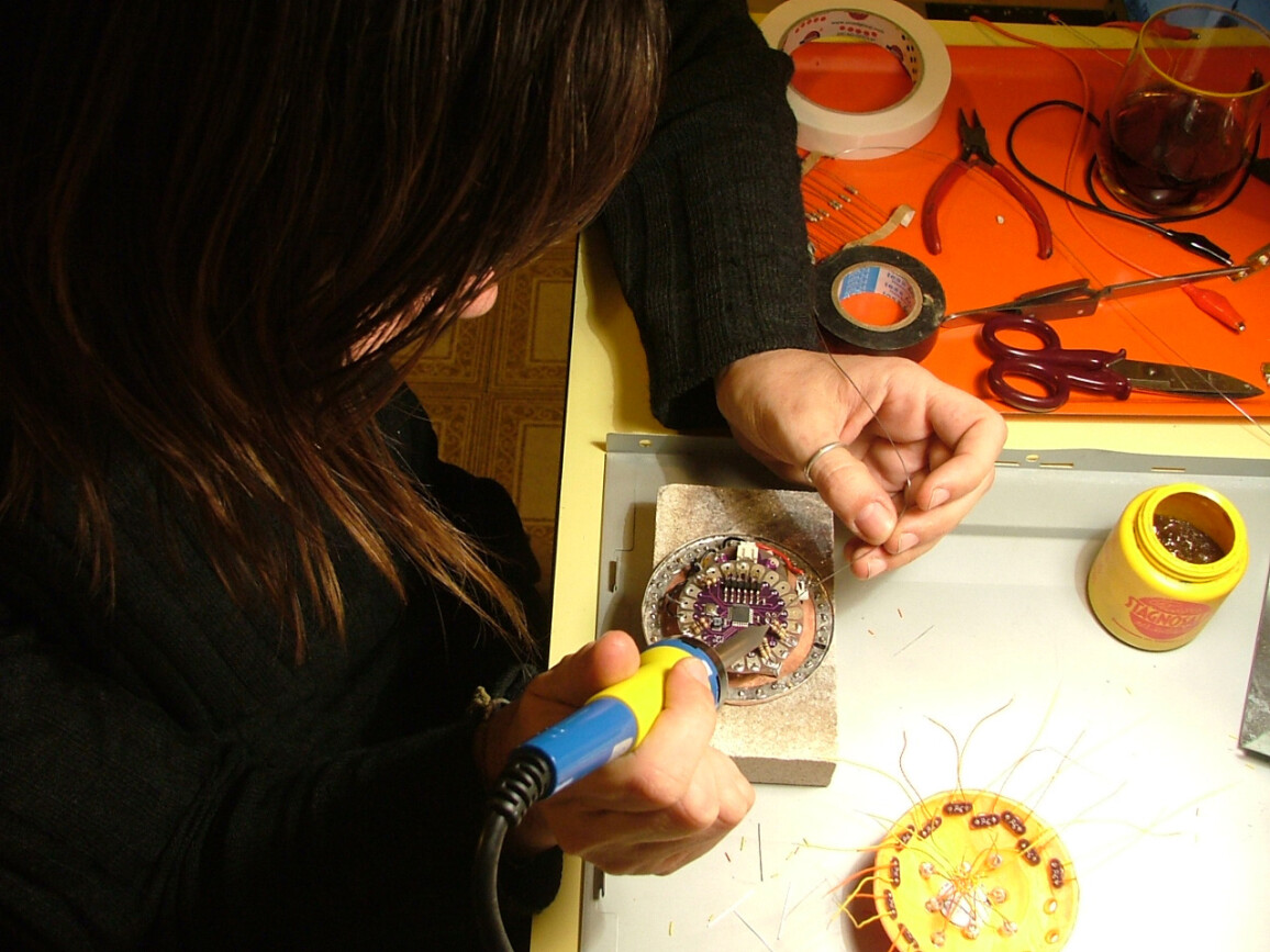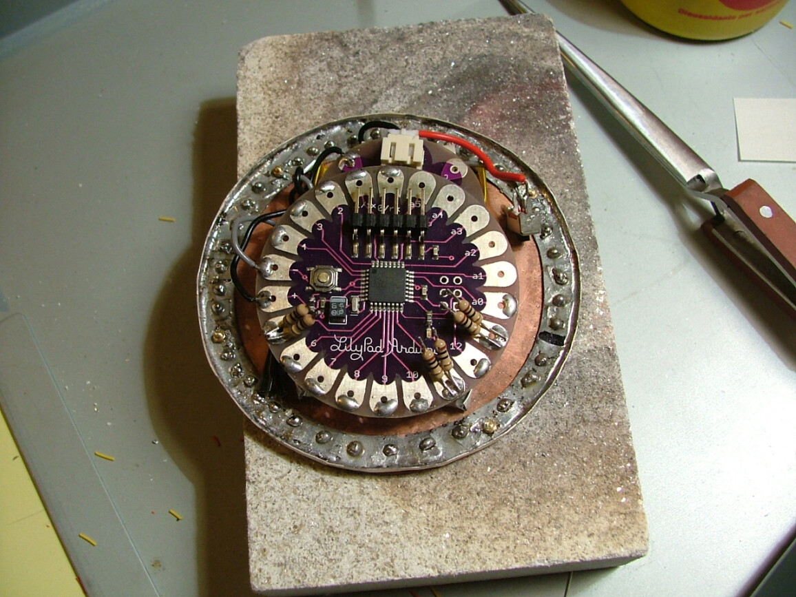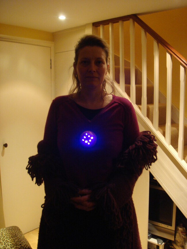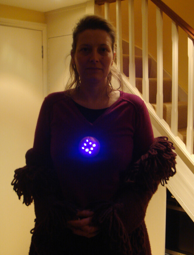 An interactive object wearable as a brooch, based on Arduino® microcontrollers. A development of the research started with the “Galaxy” series, this piece introduces a USB rechargeable system, superior luminosity and twenty-five ultra bright white, and UV LEDs. A prototype meant to broaden the potentiality of lighting design applied to small objects such as jewellery. A sensor detects the environmental lighting conditions allowing the wearer to interact with the object, switching between several lighting and colour combinations.