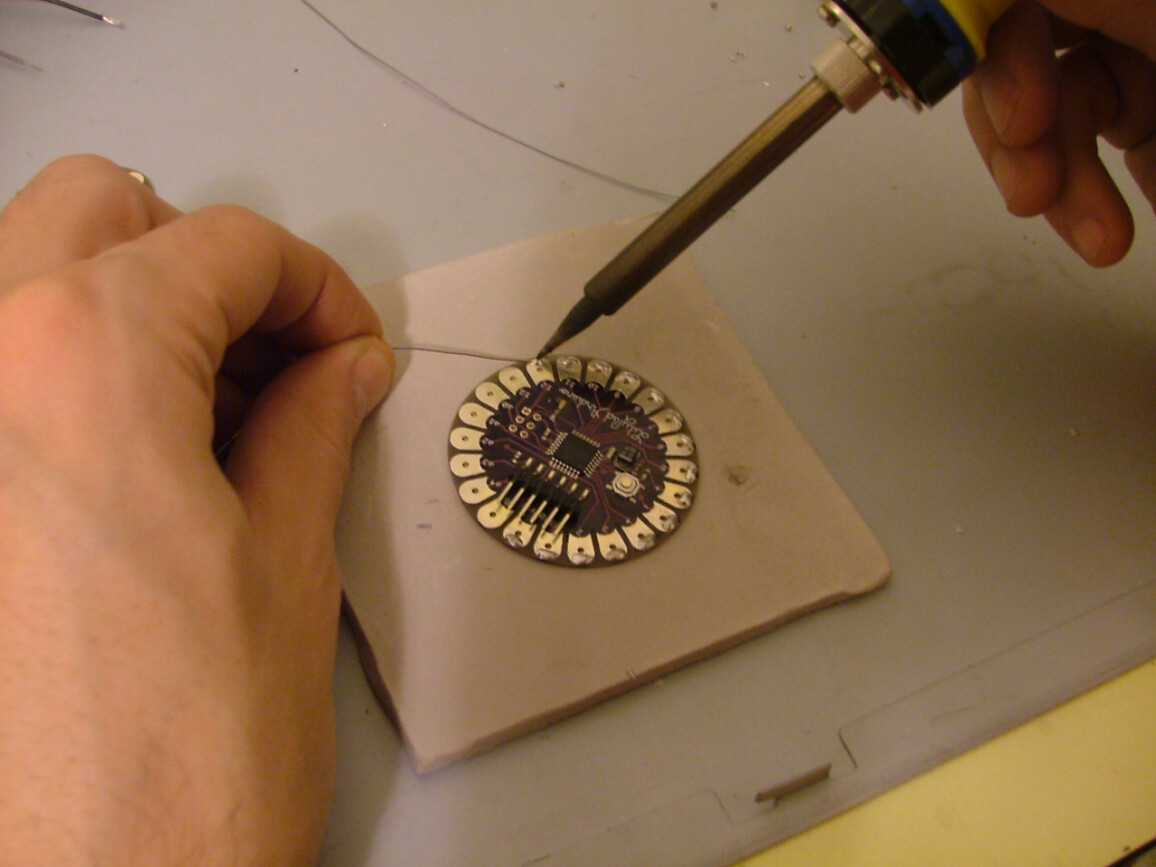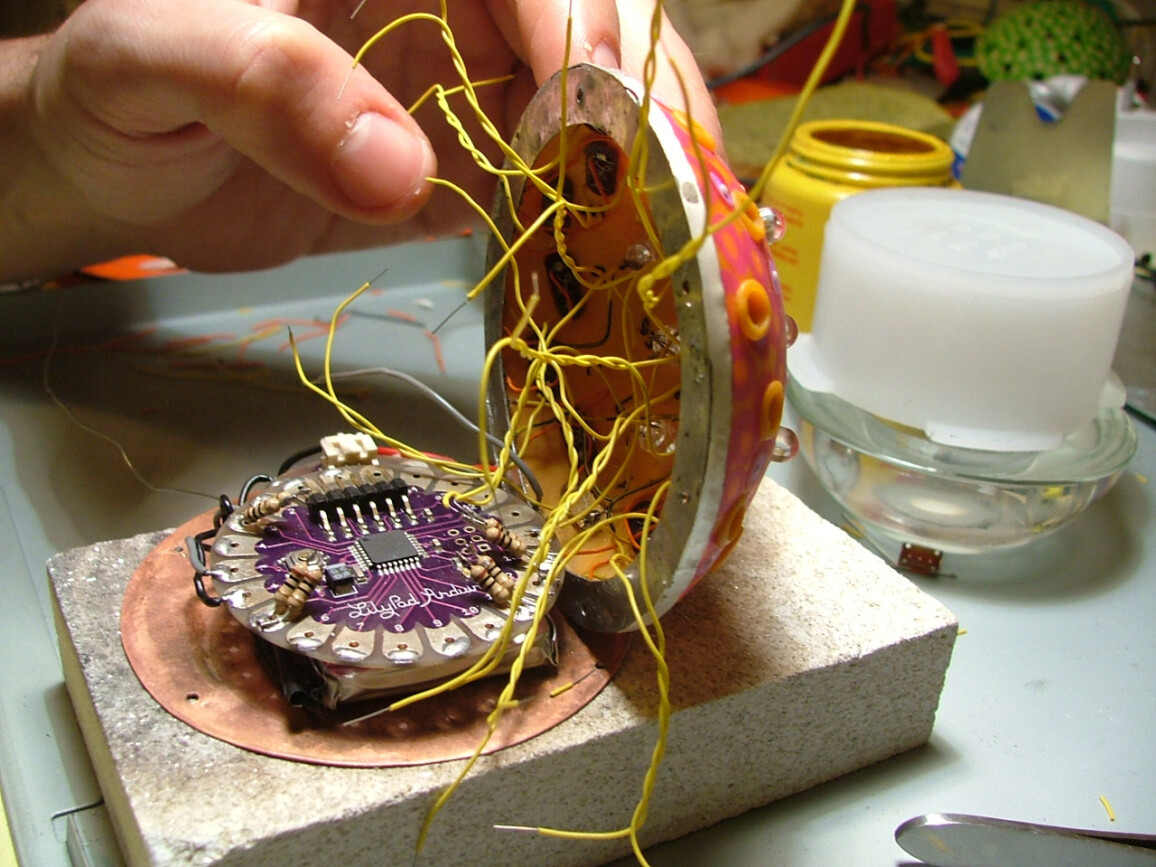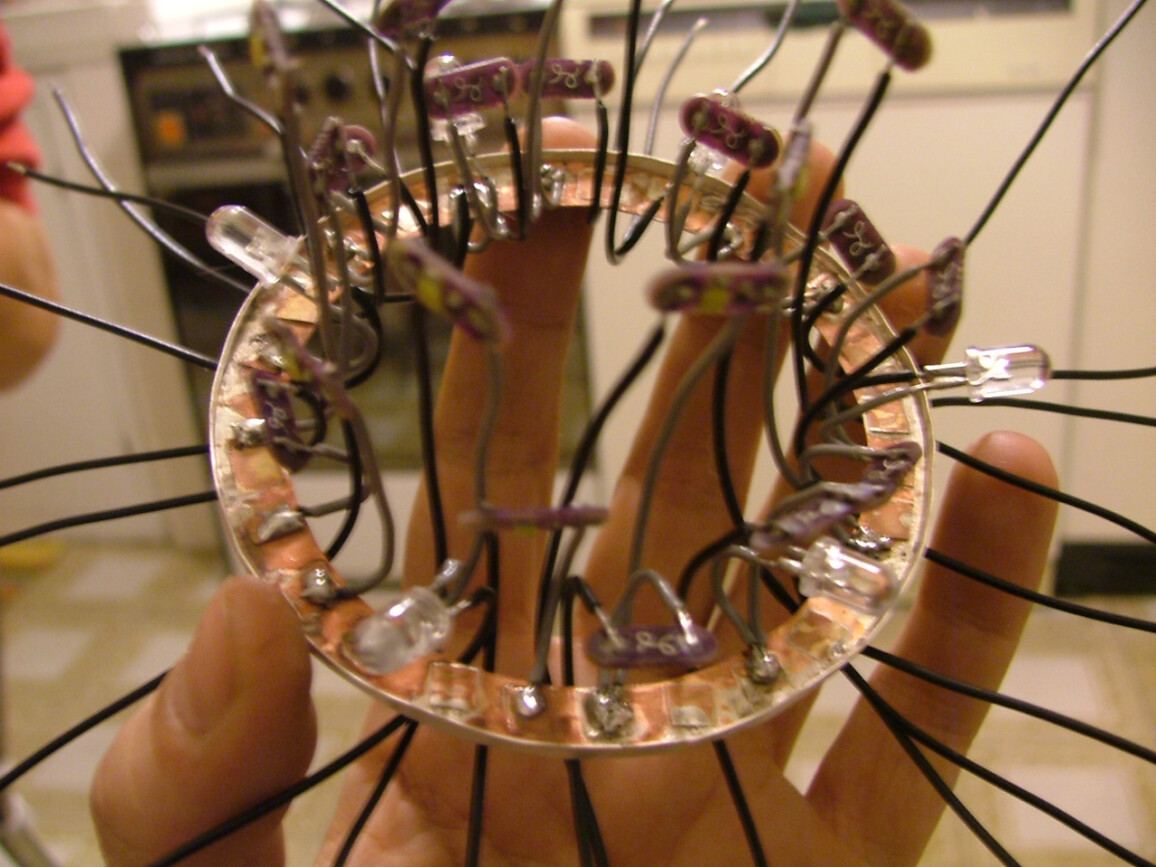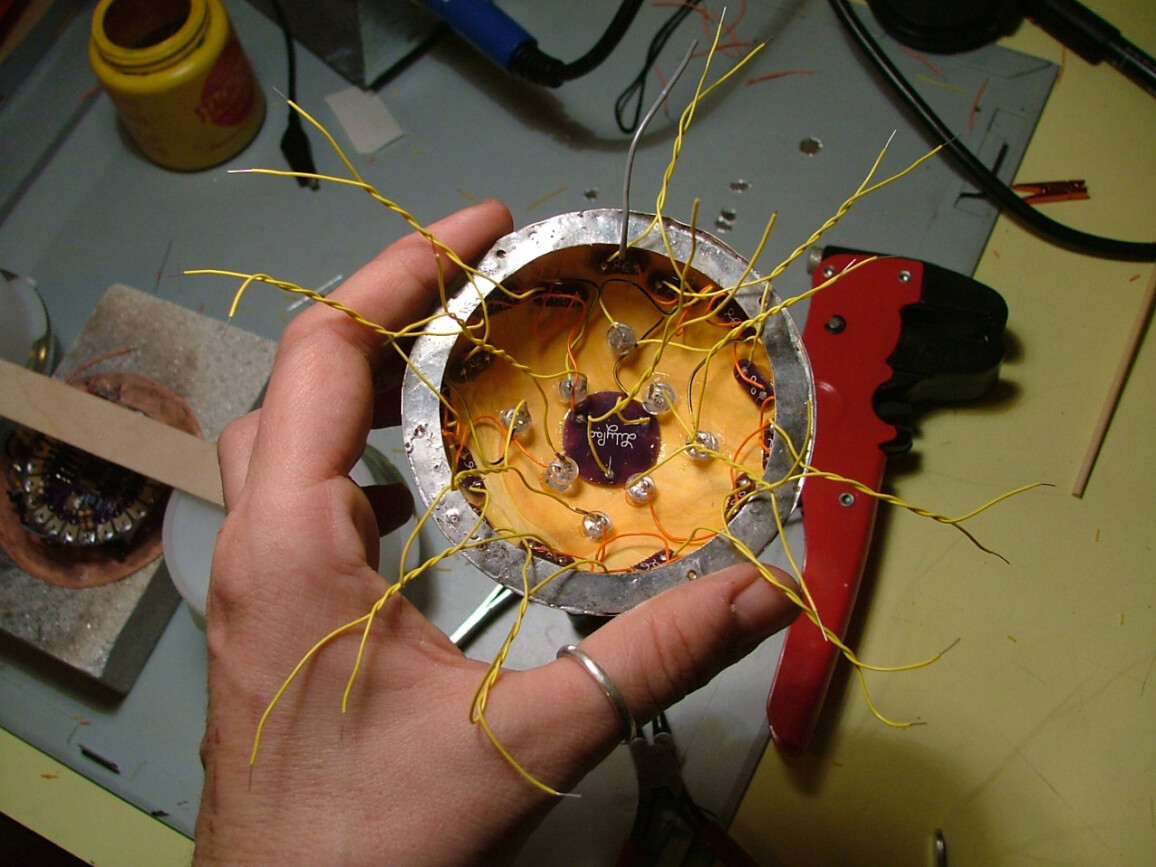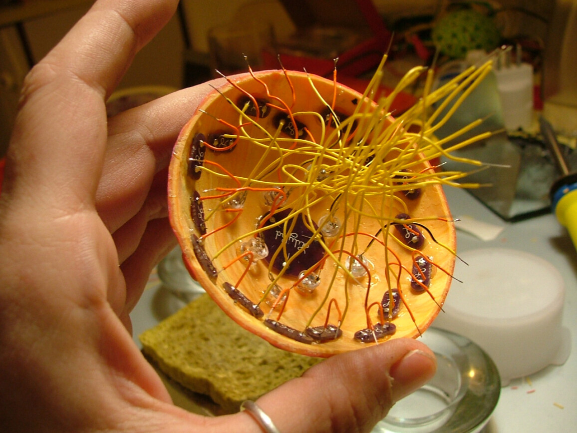An interactive object wearable as a brooch, based on Arduino® microcontrollers. A development of the research started with the “Galaxy” series, this piece introduces a USB rechargeable system, superior luminosity and twenty-five ultra bright white, and UV LEDs. A prototype meant to broaden the potentiality of lighting design applied to small objects such as jewellery. A sensor detects the environmental lighting conditions allowing the wearer to interact with the object, switching between several lighting and colour combinations.